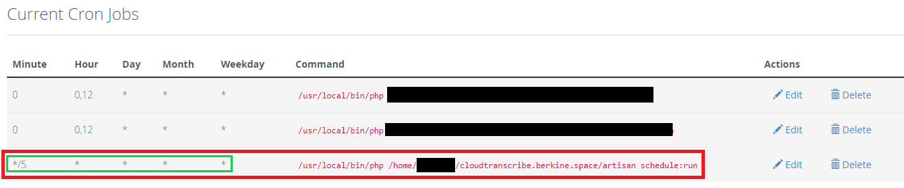 • */5 * * * * /usr/local/bin/php /home/username/YOURDOMAINPATH/artisan schedule:run